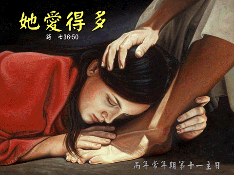 Một hôm, có người thuộc nhóm Pha-ri-sêu mời Đức Giê-su dùng bữa với mình. Đức Giê-su đến nhà người Pha-ri-sêu ấy và vào bàn ăn. Và kìa một phụ nữ vốn là người tội lỗi trong thành, biết được Người đang dùng bữa tại nhà ông Pha-ri-sêu, liền đem theo một bình bạch ngọc đựng dầu thơm. Chị đứng đằng sau, sát chân Người mà khóc, lấy nước mắt mà tưới ướt chân Người. Chị lấy tóc mình mà lau, rồi hôn chân Người và lấy dầu thơm mà đổ lên. Thấy vậy, ông Pha-ri-sêu đã mời Người liền nghĩ bụng rằng: "Nếu quả thật ông này là ngôn sứ, thì hẳn phải biết người đàn bà đang đụng vào mình là ai, là thứ người nào: một người tội lỗi!" Đức Giê-su lên tiếng bảo ông: "Này ông Si-mon, tôi có điều muốn nói với ông!" Ông ấy thưa: "Dạ, xin Thầy cứ nói". Đức Giê-su nói: "Một chủ nợ kia có hai con nợ: một người nợ năm trăm quan tiền, một người năm chục. Vì họ không có gì để trả, nên chủ nợ đã thương tình tha cho cả hai. Vậy trong hai người đó, ai mến chủ nợ hơn?" Ông Si-mon đáp: "Tôi thiết tưởng là người đã được tha nhiều hơn". Đức Giê-su bảo: "Ông xét đúng lắm". Rồi quay lại phía người phụ nữ, Người nói với ông Si-mon: "Ông thấy người phụ nữ này chứ? Tôi vào nhà ông: nước lã, ông cũng không đổ lên chân tôi, còn chị ấy đã lấy nước mắt tưới ướt chân tôi, rồi lấy tóc mình mà lau. Ông đã chẳng hôn tôi một cái, còn chị ấy từ lúc vào đây, đã không ngừng hôn chân tôi. Dầu ô-liu, ông cũng không đổ lên đầu tôi, còn chị ấy thì lấy dầu thơm mà đổ lên chân tôi. Vì thế, tôi nói cho ông hay: tội của chị rất nhiều, nhưng đã được tha, bằng cớ là chị đã yêu mến nhiều. Còn ai được tha ít thì yêu mến ít". Rồi Đức Giê-su nói với người phụ nữ: "Tội của chị đã được tha rồi". Bấy giờ những người đồng bàn liền nghĩ bụng: "Ông này là ai mà lại tha được cả tội?" Nhưng Đức Giê-su nói với người phụ nữ: "Lòng tin của chị đã cứu chị. Chị hãy đi bình an". Sau đó, Đức Giê-su rảo qua các thành phố, làng mạc, rao giảng và loan báo Tin Mừng Nước Thiên Chúa. Cùng đi với Người, có Nhóm Mười Hai và mấy người phụ nữ đã được Người trừ quỷ và chữa bệnh. Đó là bà Ma-ri-a gọi là Ma-ri-a Mác-đa-la, người đã được giải thoát khỏi bảy quỷ, bà Gio-an-na, vợ ông Khu-da quản lý của vua Hê-rô-đê, bà Su-san-na và nhiều bà khác nữa. Các bà này đã lấy của cải mình mà giúp đỡ Đức Giê-su và các môn đệ.